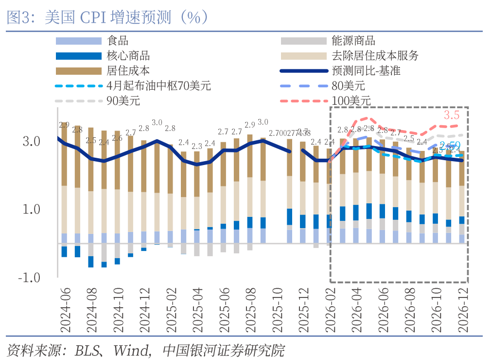 70、80美元大约对应着霍尔木兹海峡较快恢复通航,前者是原油产能较快恢复的情况,而后者是当前破坏的产能难以重建的情况;如果冲突在数月而非数周内解决,那么90和100美元的WTI原油也有概率出现。我们目前的基准假设是WTI全年在略高于80美元/桶的中枢稳定,对应着名义CPI大约在2.7%-3.1%的范围内波动,而核心通胀仍在2.5%或略低的水平。极端情况下,油价可能持续高于100美元,那么名义CPI的波动范围最少(不考虑天然气涨价和向其他价格的传导)将升到2.9%-3.7%,如果进一步考虑通胀预期和生产成本抬升,则名义CPI可能阶段性达到4%以上的水平。基准能源价格假设的情况下,我们认为外生性能源通胀在通胀预期稳定后不会明显压缩美联储的降息空间,即仍有2-3次共计50-75BP;但如果能源价格长期处于100美元或更高的极端位置,那么担心再次误判的美联储虽然不会加息,但降息空间可能压缩至0至1次。